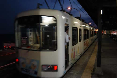 今日の鎌倉は晴れ。いよいよ待ちに待った「江ノ電ビール電車」の日だ。メーリングリストのオフ会である。イベント電車にはもう何回も乗車してきたが、今回は以前にも増してチケット入手がたいへんだった。認知度があがってきている一方で、電車の便数が増えていないというのがネックとなり、ゲットできる確率が下がってきているのだろう。もっとも、メーリングリストは「遊び」となった場合の組織結束力はとても強い。以前にも「Biglobe文化祭2000」と言う企画で、5万円の商品券をゲットした実績があるのだ。今回は14名分のチケットをゲットすることができた(もちろん正規の一般申し込みです)。イベント電車のチケット入手方法については内緒です。 さて、イベント電車の昼間はおいしいビールを飲むために散策。まずは佐助の雲母(きらら)で名物の「白玉クリームあんみつ」を食べた。観光客の少ない夏で昼前と言うこともあり、お店にはわれわれ以外は誰もいない。この後、大仏を経由して由比ヶ浜まで散策した。私は所用のため、由比ガ浜から江ノ電に乗り稲村ガ崎で下車し、七里ガ浜まで歩きながら写真を撮った。夕方藤沢での用事を済ますと江ノ電で鎌倉高校前駅まで戻った。ちょうどここで江ノ電ビール電車の第一便にすれ違う。電車の中はとても楽しそうだ。約1時間後の自分のシチュエーションを見ているようで、わくわくしてくる。今回は二便乗車なので、時間はまだたっぷりある。七里ガ浜の駅まで夜道を歩き、江ノ電で鎌倉駅に向かった。さあ、いよいよスタートだ。 江ノ電ビール電車の詳細については、「湘南スタイル vol.11」(2002年9月26日発売)のコラムに書いたのでそちらを参照して欲しい。ひとことで言うならば、「スパークする江ノ電」と言ったところだろうか。今日も夜は長い。