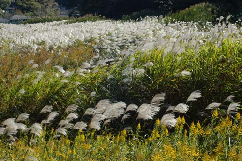 今日の鎌倉も晴れ。今週も先週の散策と似たようなコースで永福寺跡のすすきを見に行った。まずは大船駅から鎌倉湖畔循環バスに乗り、半僧坊下バス停で下車。今泉台6丁目公園から天園ハイキングコースへあがり、そのまま覚園寺ハイキングコースを進んだ。先週は見なかった覚園寺百八やぐらもゆっくりとみてまわって。やぐらは鎌倉時代から室町時代の僧侶や武士のお墓と伝えられているかなり古いものだが、詳しい資料が残っているわけでもなく、誰の墓なのかは分かっていない。また、江戸の地名や年号が書かれた石碑や地蔵が置かれているのも謎を深めている。百八ものお墓があるので昔の霊園のようなものなのかもしれない。詳しい調査を待ちたいところだ。百八やぐらから覚園寺ハイキングコースを進み、西ヶ谷住宅地を抜けて永福寺跡に降りた。今日は強い風にすすきの穂が大きく揺れていた。永福寺は宇治の平等院に匹敵する大伽藍を誇ったお寺だったそうだが、火事で全てが焼失し再建されなかったと伝えられている。まさに「つわものどもが夢の跡」だ。今日はそんなことを思いつつビールを飲みながら風にたなびくすすきを見ていた。永福寺跡から大塔宮へ出てバスで鎌倉駅まで行こうと思っていたのだが、バスは来そうに無く、バスに乗ったとしても連休中日の大渋滞でかなり時間もかかりそうだったので、鎌倉駅まで歩いた。途中、雪の下の「旭屋」で豆大福を買い、小町の「キャラウェイ」でテイクアウトのカレー・ルーを調達した。鎌倉駅からは江ノ電に乗り七里ガ浜へ向かった。江ノ電の鎌倉駅には電車を待つ人がたくさんおり、乗った電車はJRの通勤電車なみの混みようだった。江ノ電は15分ほどで七里ガ浜に到着。七里ガ浜の駅から出ると海からの強い風が打ち付けてきた。今日の海は強風で波が消されてしまい、サーフィンをやる人はごくわずかで、ウインドサーフィンをやる人が七里ガ浜の東側にたくさん出ていた。