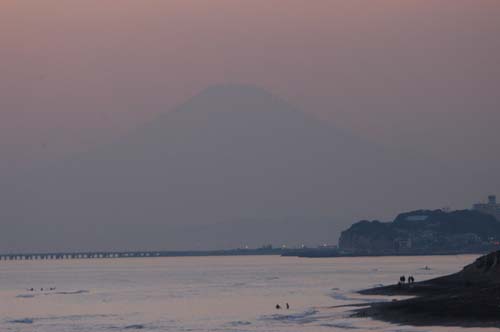 今日も湘南は晴れ。今日は鎌倉高校前から稲村ガ崎まで歩き、稲村ガ崎海浜公園で日没を迎えた。雲が無く夕焼けにはならなかったが、陽が箱根の山に沈むとうっすらと富士山が浮かび上がってきた。夜は横浜で新年会があったため、稲村ガ崎を後にして江ノ電・横須賀線・東海道線と乗り継いで横浜に向かった。昨日も一昨日も新年会で三日連続の飲み会だったが、横浜駅近くのスカイラウンジ(知人のマンションに併設されている)からの夜景は見事で、みなとみらい・マリンタワー・ベイブリッジ、そして東京タワーまで見ることができた。アーバンライフって感じでしょうか。