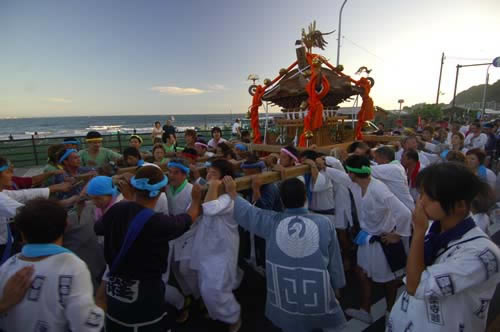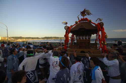 今日は朝から強烈な日差しでかなりきびしい残暑。真夏の日差しを浴びながら朝からビールを飲んでしまった。海を見ながらのビールは最高です。さて、昨日に引き続き、今日も長谷の甘縄神明宮のお祭りを見にでかけた。宮の出発は12時だが、あまりにも暑いのでコース途中の長谷観音で合流。それでもやはり今日は暑かった。