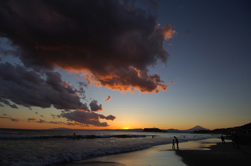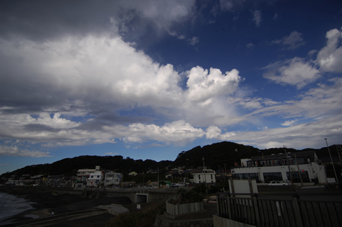 今日は朝焼けにはなりませんでしたが、一日中雲がきれいでした。午前中稲村ヶ崎から由比ヶ浜までバイクで1時間ほど撮影にでかけ、午後は長谷の市に寄ったあとに、朝バイクで飛ばした海岸線を逆方向に七里ガ浜まで散歩。久しぶりに歩きました。今日はまあまあの夕焼け空。