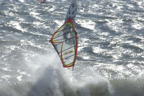 日本海を低気圧が通り抜けた湘南は強い西風が吹き荒れた。こんな日の片瀬東浜では江ノ島をバックにウインドサーファーが疾走する。