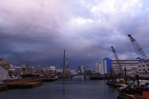 夕暮れ時の京浜工業地帯。空には黒い雲が覆い今にも雨が降り出しそう。恵比須町のあたりをちょっとまわってみる。